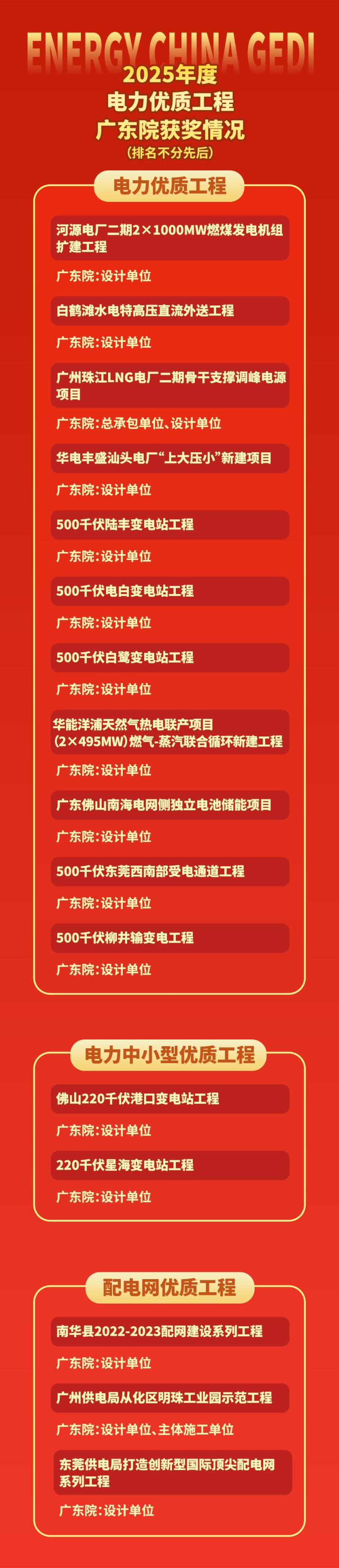 日前,中國電力建設(shè)企業(yè)協(xié)會(huì)公布2025年度電力優(yōu)質(zhì)工程評(píng)選結(jié)果,中國能建廣東院總承包建設(shè)或勘察設(shè)計(jì)的16項(xiàng)工程上榜,涵蓋火電、輸變電、綜合能源、智能微網(wǎng)等技術(shù)領(lǐng)域,充分展現(xiàn)了廣東院在電力工程設(shè)計(jì)建設(shè)領(lǐng)域的綜合實(shí)力。